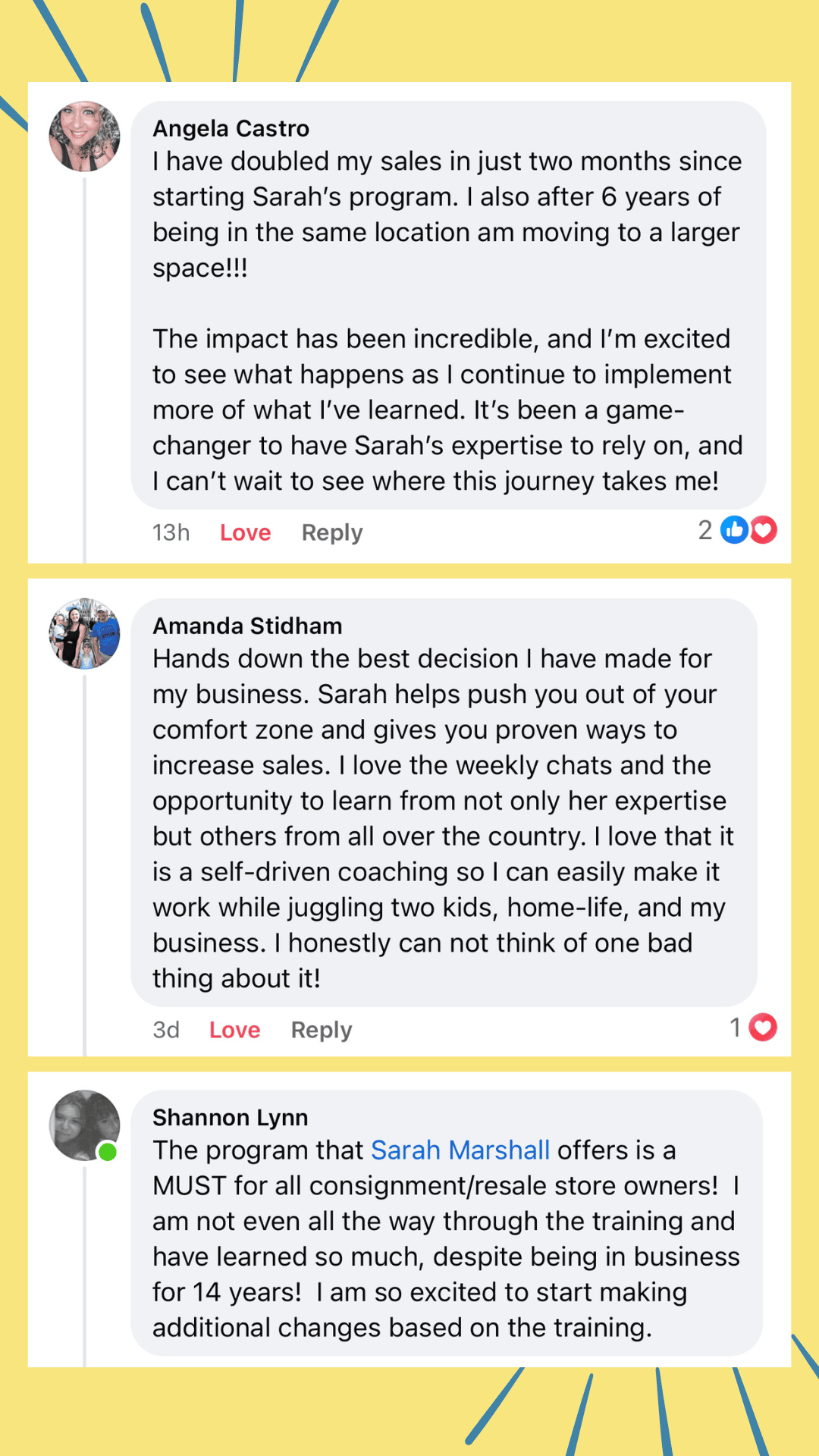 I'm coaching Consignment Store Owners in increasing their sales and foot traffic without working more hours so they can have financial freedom and the business of their dreams.