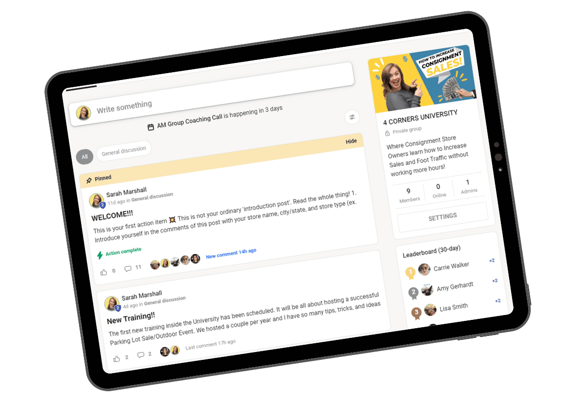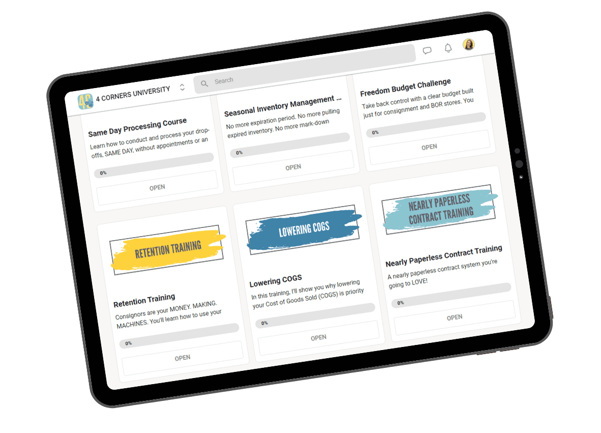 I created 4 Corners University - a monthly membership program for new and existing consignment and BOR store owners - to teach store owners my 4 Corners Model so they can increase sales and foot traffic like I did.